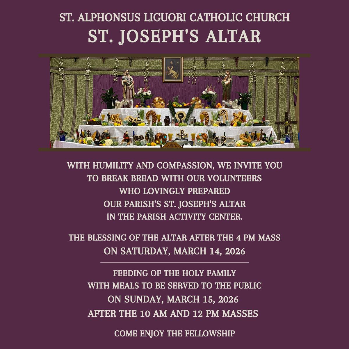 St. Alphonsus Parish will hold our next St. Joseph's Altar on March 15, 2026. Meals will be served on Sunday after the 10 AM & 12 PM Masses in the Parish Activity Center. We are very excited, but will need your help and support to make this a success. Please contact the Faith Formation Office at 225-261-4644 if you would like to be involved..jpg)
