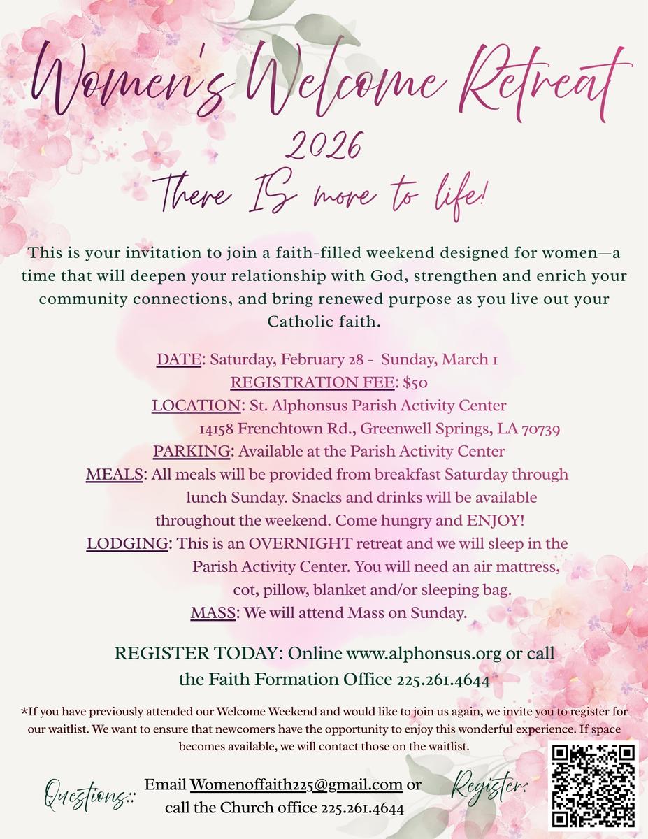 Welcome is a two-day, one-overnight renewal weekend here at St. Alphonsus. It is an experience that helps women discover what is missing in their lives and what to do about it. Most people want to work this out but have no idea how to do it or even where to start. Welcome puts a framework around the questions and struggles we all have so that every day, in every way, we can become a-better-version-of-ourselves. The ultimate objective of Welcome is to give people the opportunity to encounter Jesus.